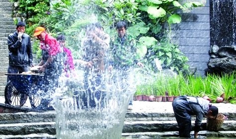 2012年12月4日,东濠涌越秀北路亲水平台,工人们将洗刷干净的石头抛入河涌.. |