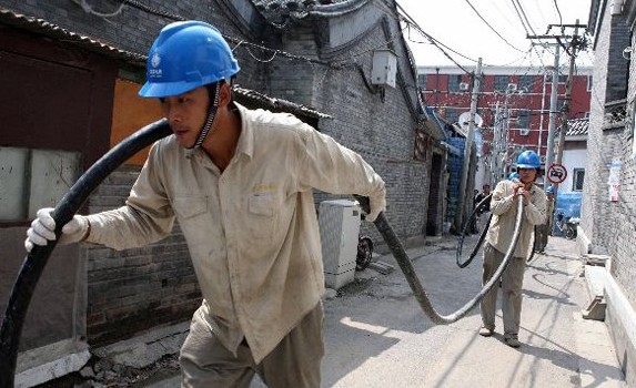 北京一处胡同内,工作人员进行“煤改电”工程施工